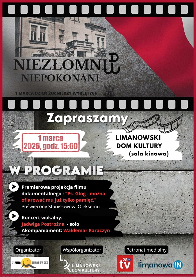 W dniu 1 marca 2026 r. niedziela o godz. 15:00 w Limanowskim Domu Kultury odbędzie się koncert "Niezłomni Niepokonani" poświęcony pamięci osób torturowanych i mordowanych przez limanowskie służby UB,SB,MO, ORMO w Pałacyku pod Pszczółką. W programie wystąpienie ks. Józefa Treli, byłego proboszcza ze Żmiącej dokumentującego zbrodnie służb komunistycznych. Projekcja filmu dokumentalnego” Ps. Głóg- ofiarować mu już można tylko pamięć” Poświęcony Stanisławowi Oleksemu. Głównym artystą koncertu będzie dr Jadwiga Postrożna –solistka Opery Wrocławskiej przy akompaniamencie Waldemara Karaczyna.Wstęp wolny.jpg)