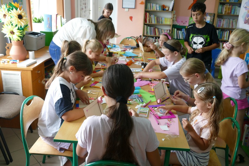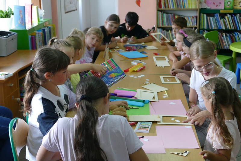 Ferie w bibliotece to również bogata oferta warsztatów plastycznych. Dzieci tworzyły ,,zimowe lampiony w słoiku” techniką decoupage, ,,zimowy krajobraz”, walentynkowe kartki i ozdoby, gipsowe serduszka, drewniane breloczki oraz własne wersje „Plastusiowego piórnika”. Zajęcia odbywały się w kilku filiach, a mali artyści wykazali się ogromną wyobraźnią i starannością. Powstałe prace zachwycały kolorami i pomysłowością, a uczestnicy z dumą zabierali je do domów.