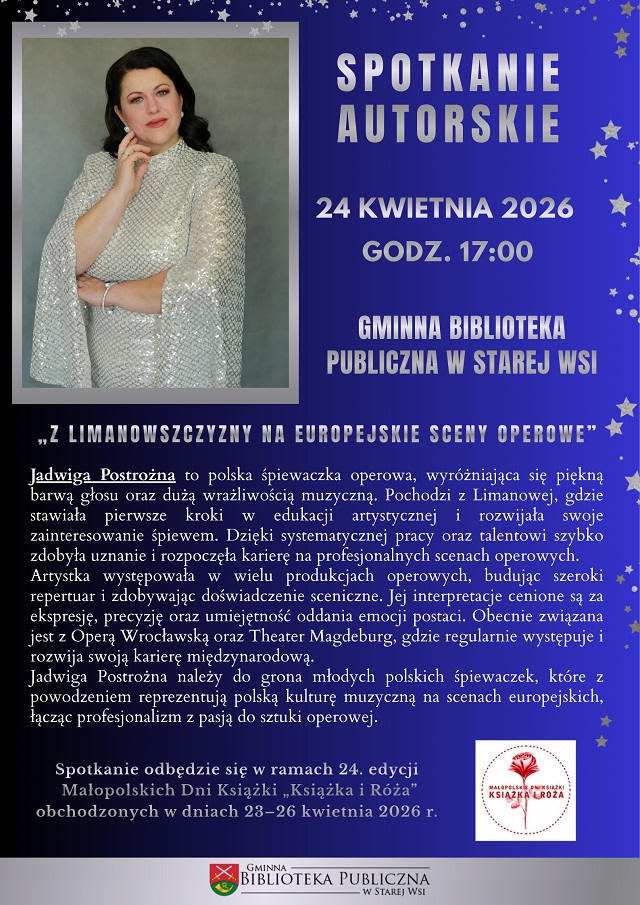 Gminna Biblioteka Publiczna w Starej Wsi serdecznie zaprasza na spotkanie autorskie z Jadwigą Postrożną pt. „Z Limanowszczyzny na europejskie sceny operowe”, które będzie wspaniałą podróżą po muzyce, wielkich scenach oraz miłości do małej ojczyzny, tradycji i rodzinnej ziemi. Wydarzenie odbędzie się 24 kwietnia (piątek) 2026 r. o godz. 17:00 w Bibliotece Publicznej w Starej Wsi.